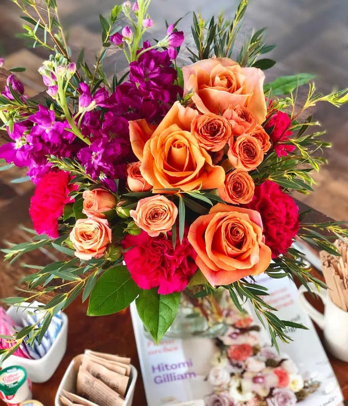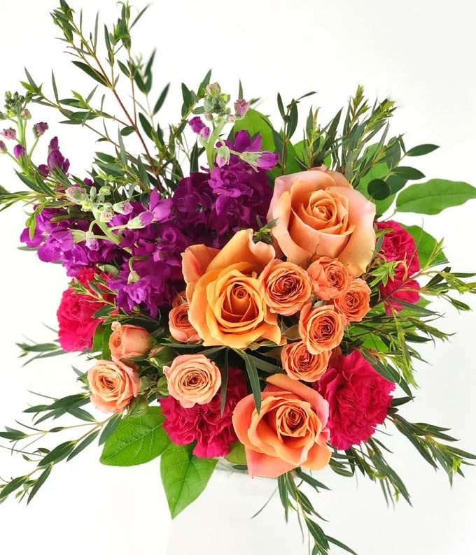 Brighten someone’s special day with a burst of vibrant colors! This lively birthday bouquet features a stunning mix of blooms, including cheerful orange roses, soft pink carnations, and playful orange spray roses. Each arrangement is expertly crafted by a local florist and displayed in a sleek glass cube vase.