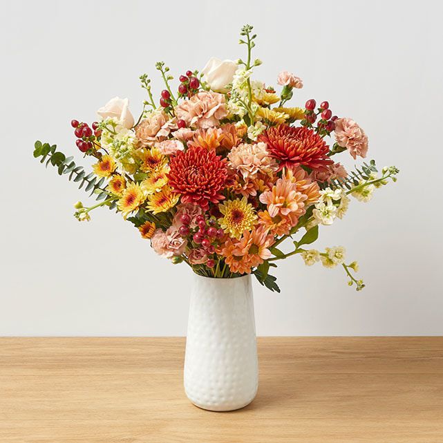 The Cinnamon Bouquet brings cozy vibes with its blend of fluffy bronze mums, peach daisies and roses, sunny yellow spray roses, carnations, pompons, and a touch of eucalyptus. The earthy tones and soft textures are perfect for fall, wrapping you in warmth like your favorite sweater.
