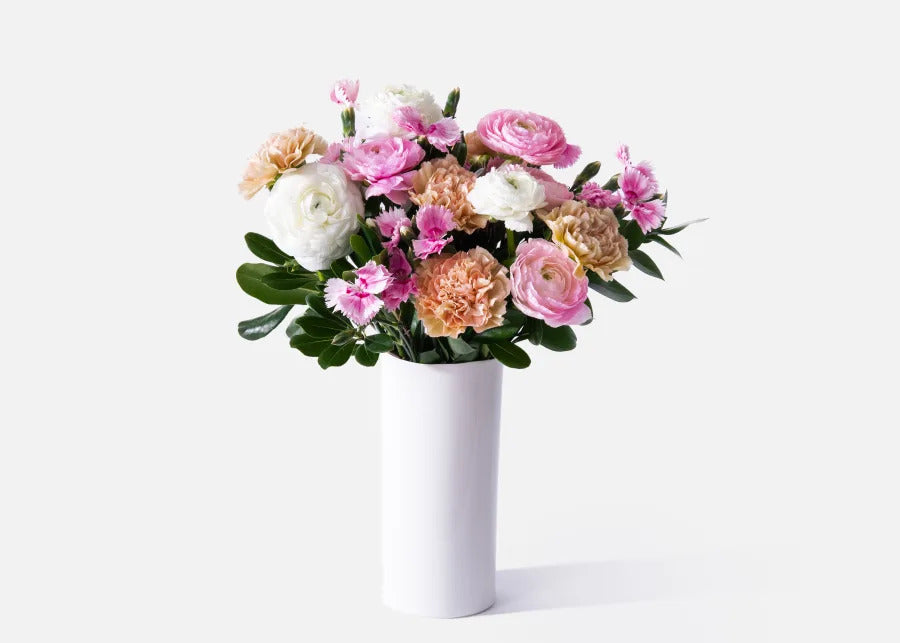 The graceful ranunculus, solomio, and carnations combine to offer a sense of understated beauty, while the rich greenery adds depth and contrast. Whether you’re celebrating a birthday, sending love, or simply brightening up a space, The Blush is the kind of bouquet that does it all with effortless grace.