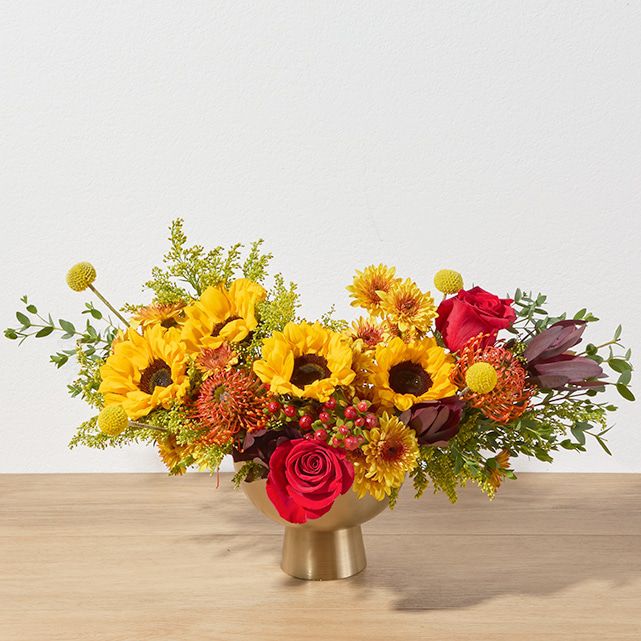 The Brighten Up Arrangement is bursting with festive energy, featuring a lively mix of orange pompons, leptospermum, solidago, red hypericum, sunflowers, red roses, safari sunset, playful craspedia, and orange pincushions. It’s a colorful celebration in a vase, perfect for adding a splash of joy.